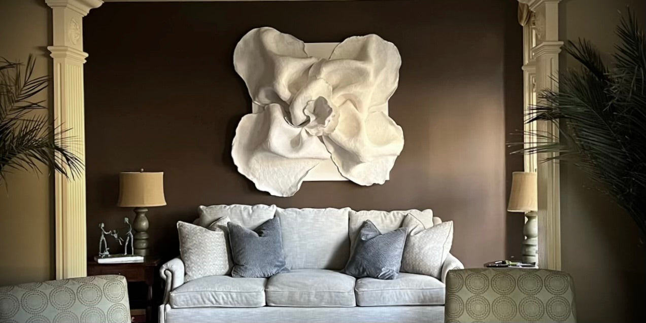 Kelly Sullivan found her artistic calling later in life after working as a registered nurse and raising three children. She has become well-known for her floral design work in the Tuscaloosa, Alabama area and translates her passion for florals and botanicals into her new passion, three-dimensional plaster sculpture. Her pieces are simultaneously both raw and soft and add tremendous dimension and interest to any room. She lives and works from her home studio in Tuscaloosa.